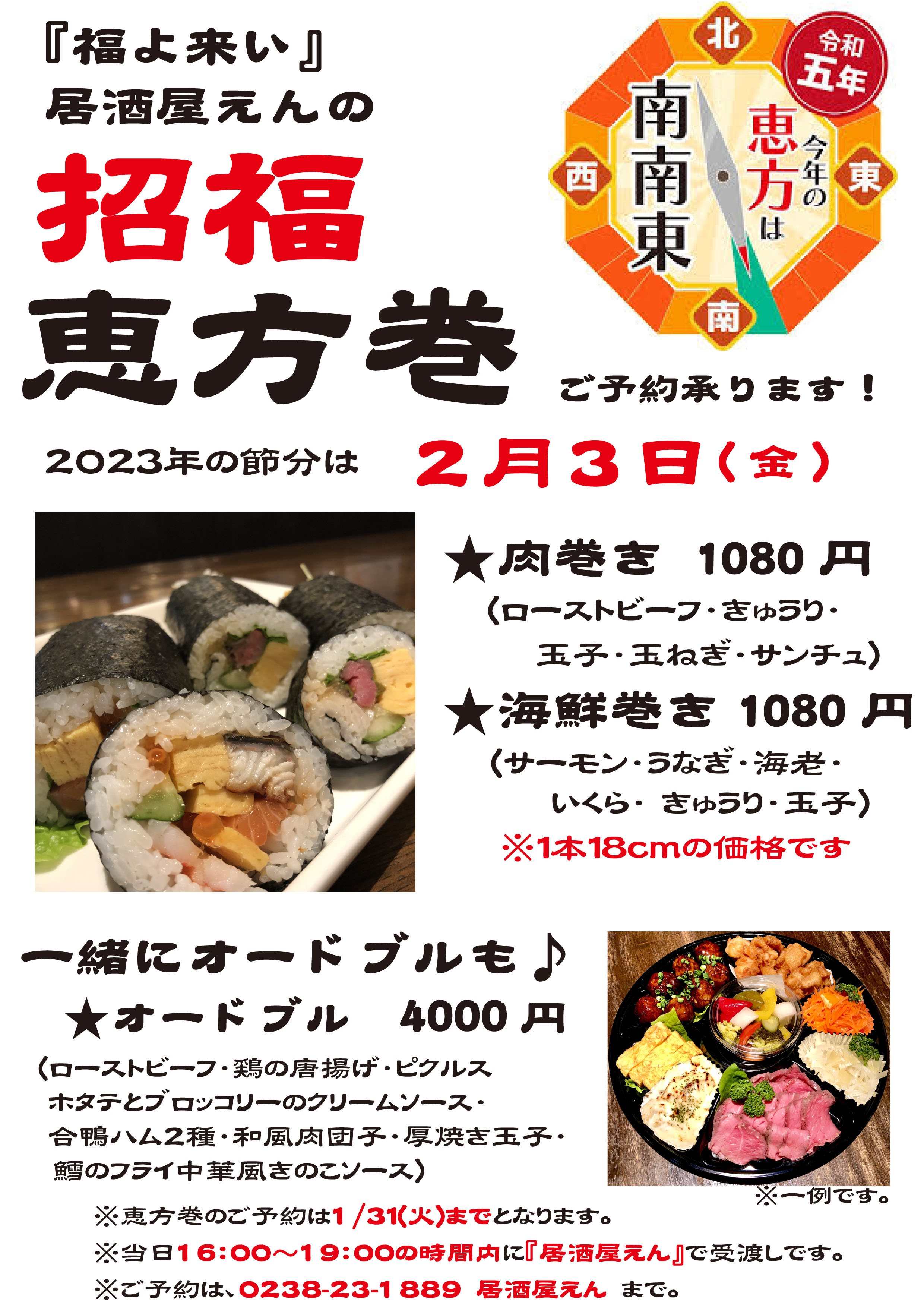 恵方巻のご予約は、2023/1/31までとなっておりますので、お早めにご予約ください。