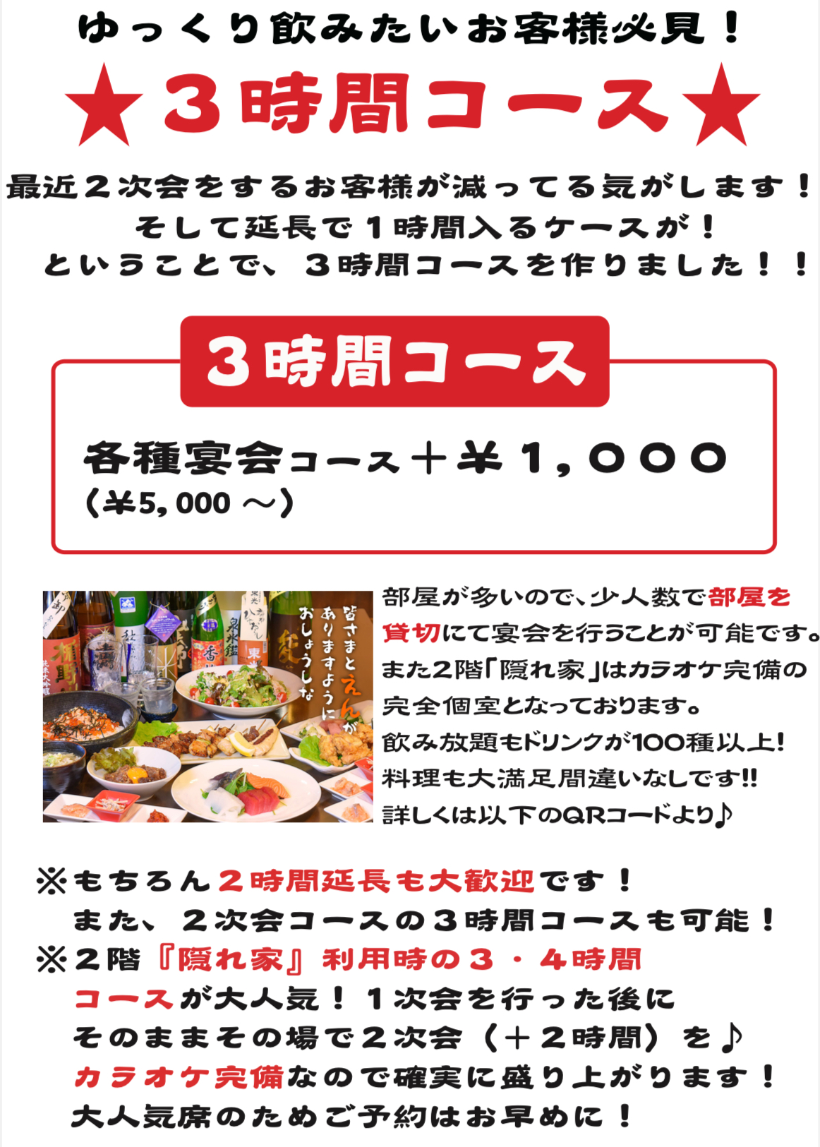 ※2階『隠れ家えん』は人気席になるので最初から3時間コースを入れるのをおすすめします。